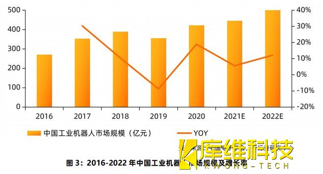 工業(yè)機器人應用市場。而據(jù)國家統(tǒng)計局公布的數(shù)據(jù)顯示,繼2020年全國工業(yè)機器人產(chǎn)量突破20萬套大關后,2021年全國工業(yè)機器人產(chǎn)量成功突破30萬套大關,達到36.6萬套,同比增長44.9%,創(chuàng)歷史新紀錄。伴隨著國內工業(yè)制造領域的生產(chǎn)智能化改造和數(shù)字化升級的浪潮,工業(yè)機器人將繼續(xù)保持樂觀的發(fā)展前景,預計2022年我國工業(yè)機器人市場規(guī)模將迫近500億元。