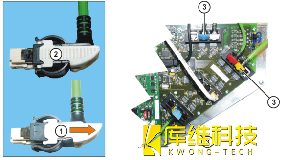 1. 關(guān)閉控制系統(tǒng)并采取確安措施防止未經(jīng)授權(quán)的重啟2. 將數(shù)據(jù)線插頭解鎖拔出控制柜 (CCU ) 上的所有接線解鎖數(shù)據(jù)線插頭如下圖