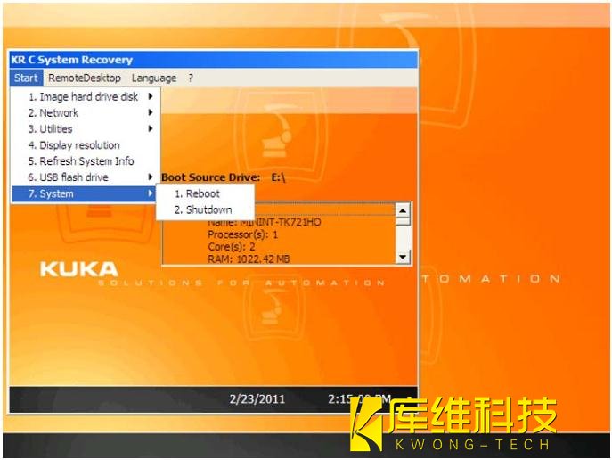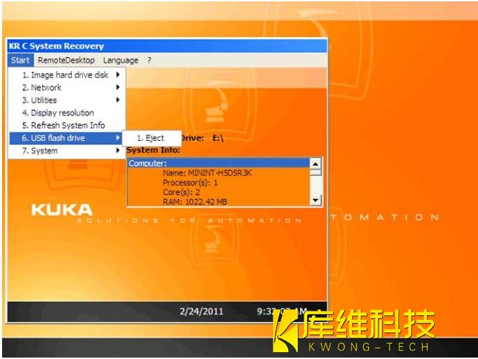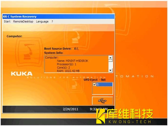 2. 插上具有起動功能的庫卡 U 盤,然后重啟控制系統(tǒng)。