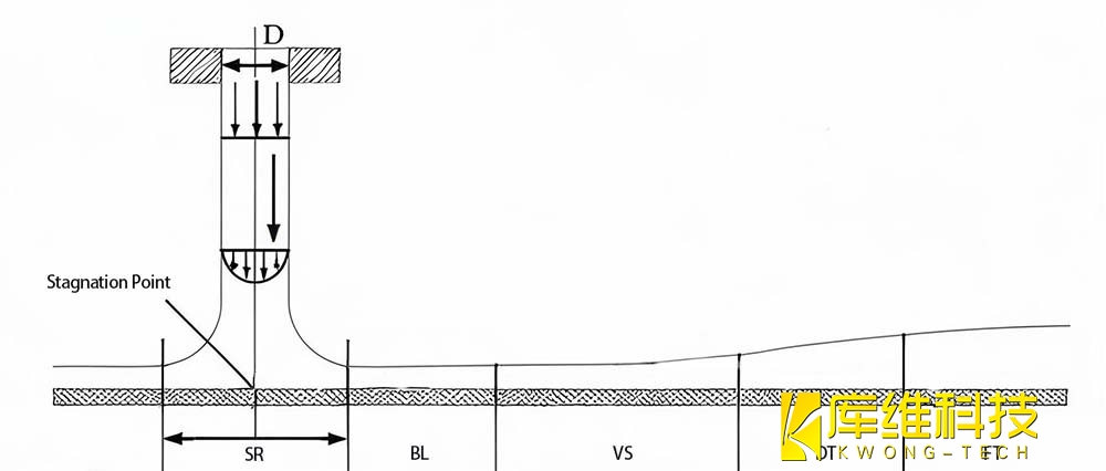 如圖3所示,射流沖擊加工表面后形成駐點(Stagnation Point),水流在此處分裂為薄層液膜(Stagnation Region, SR)。隨后依次形成: