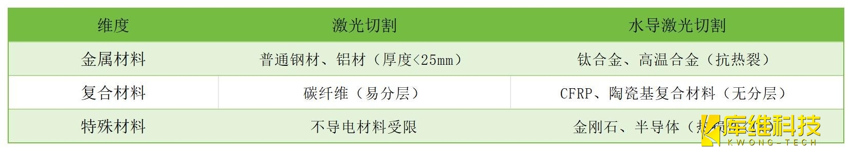 ??激光切割對(duì)導(dǎo)電金屬效率更高,但復(fù)合材料易產(chǎn)生分層;水導(dǎo)激光通過(guò)水流抑制熱應(yīng)力,可加工高硬度、熱敏感材料。